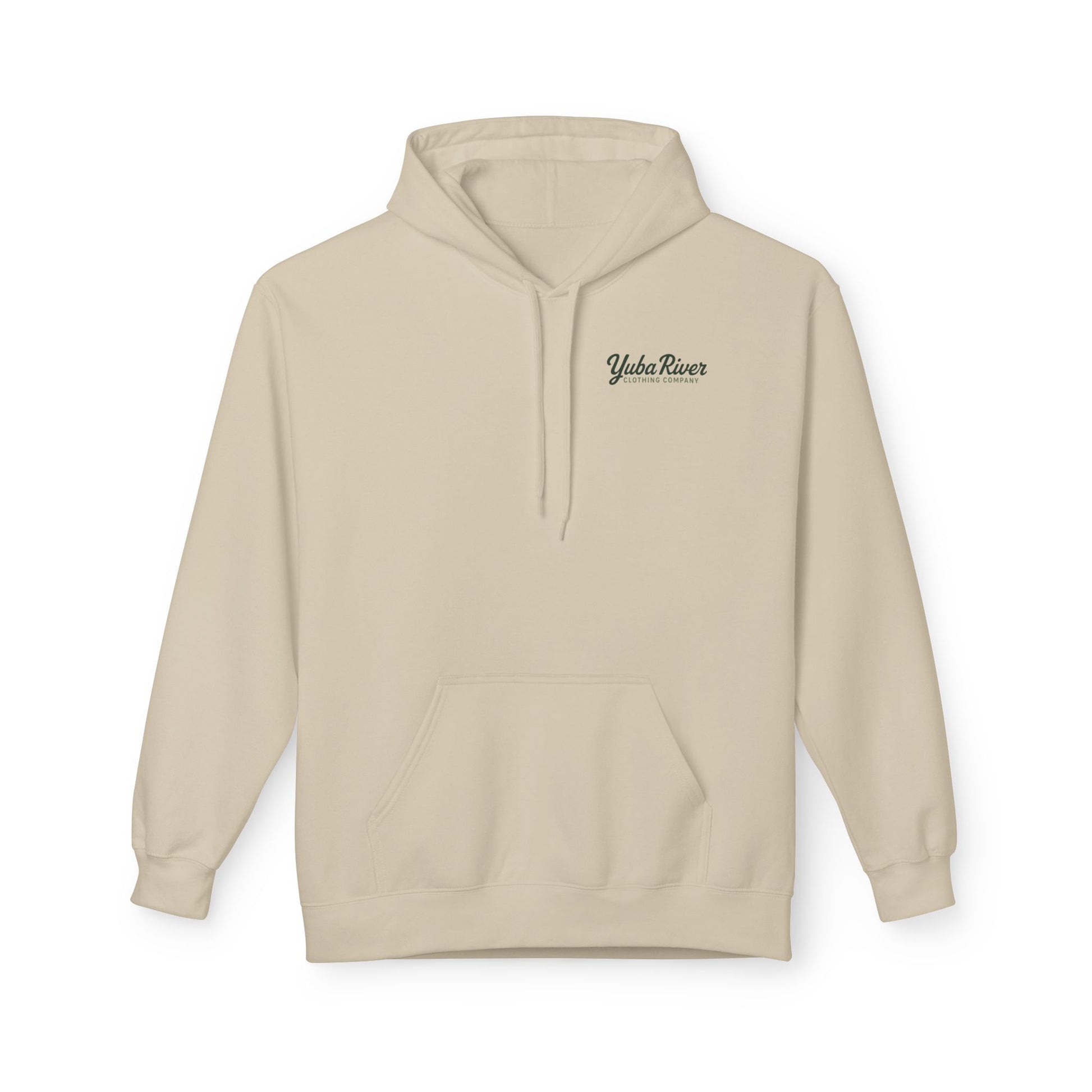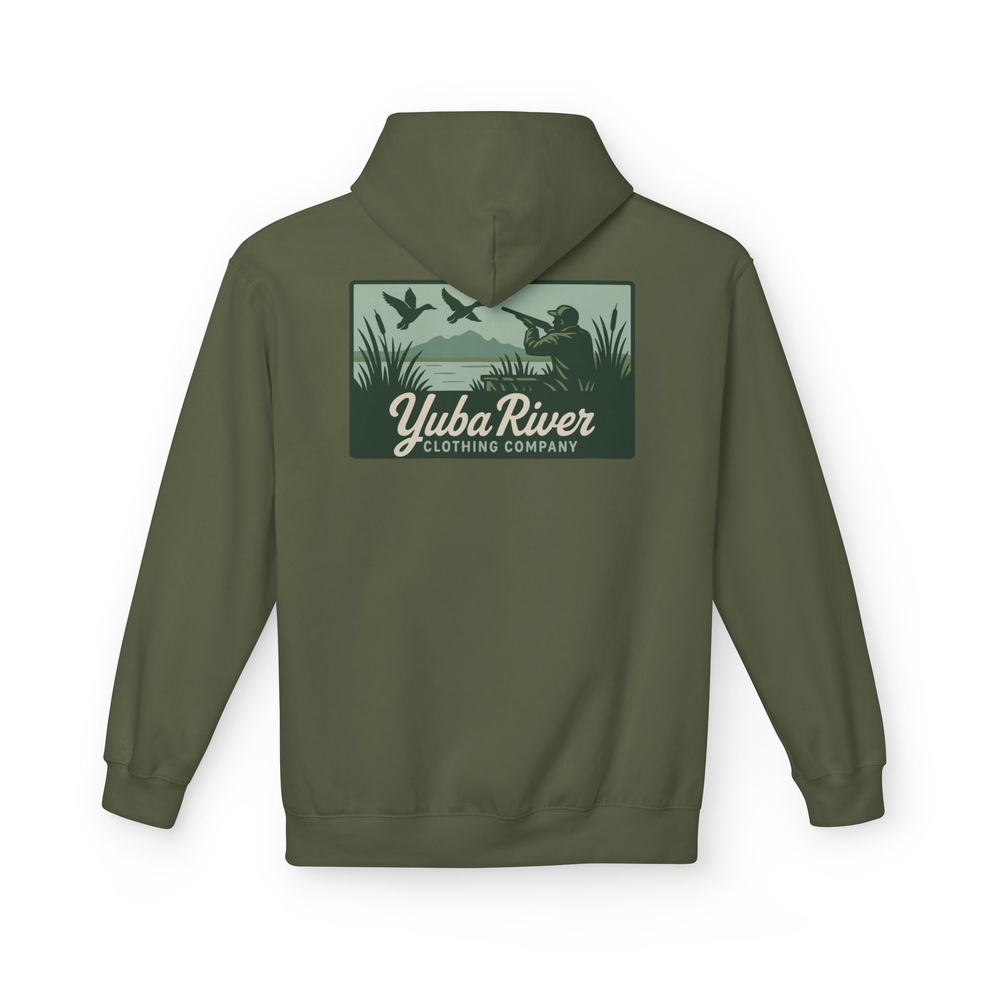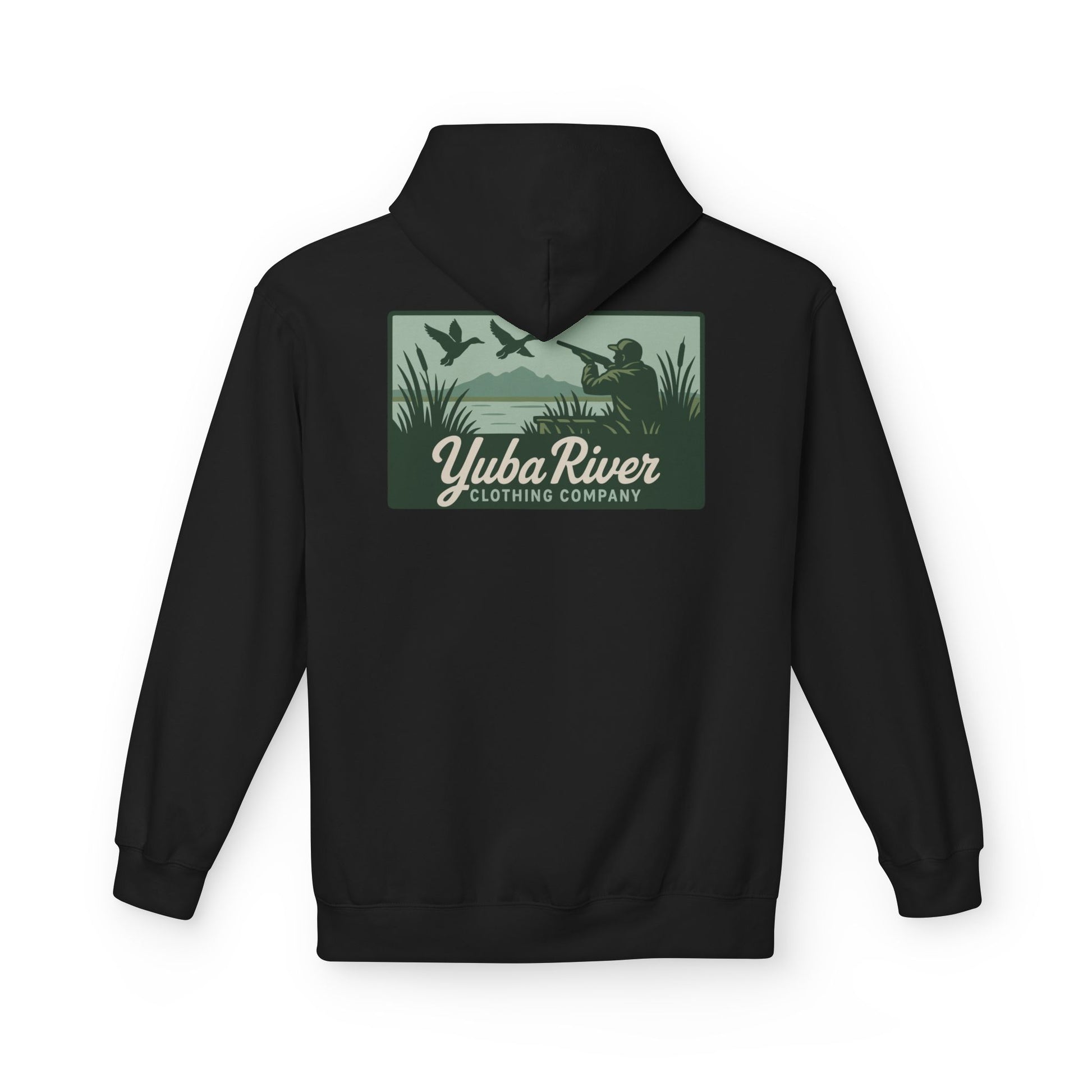Built for early mornings in the blind and cool evenings by the fire, the Flyway Hoodie is a tribute to the hunt, the habitat, and the heritage of the valley. This midweight hoodie features a bold back print of a hunter posted in the reeds, ducks overhead, and the Sutter Buttes rising in the distance. It’s more than a hoodie — it’s a snapshot of home.